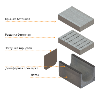 Для изготовления данных изделий поверхностного дренажа используется наполнитель (песок, щебень, вода), вяжущее вещество (цемент), армирующие фиброволокна и добавки для бетона. Благодаря этому выпущенная продукция обладает более высокими: